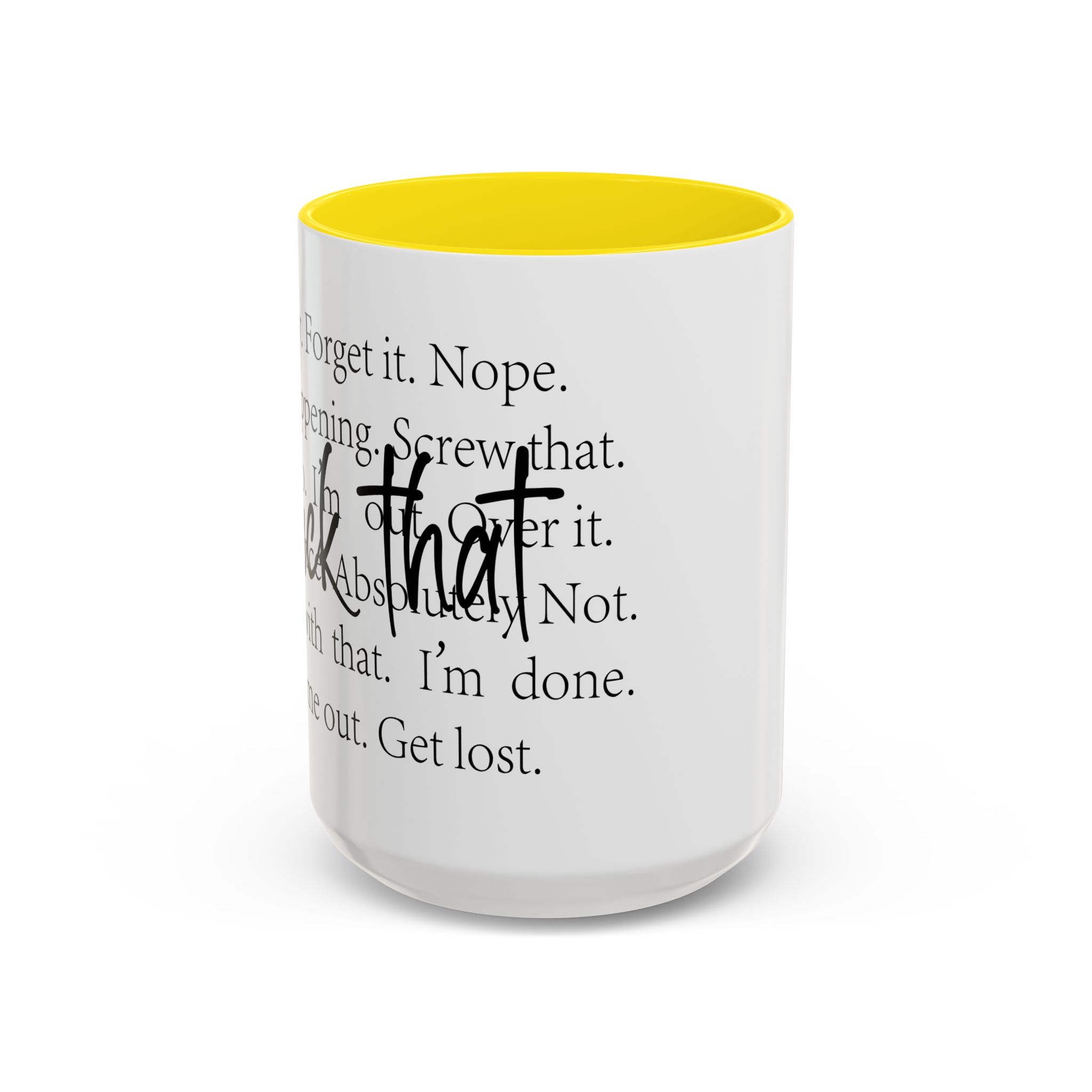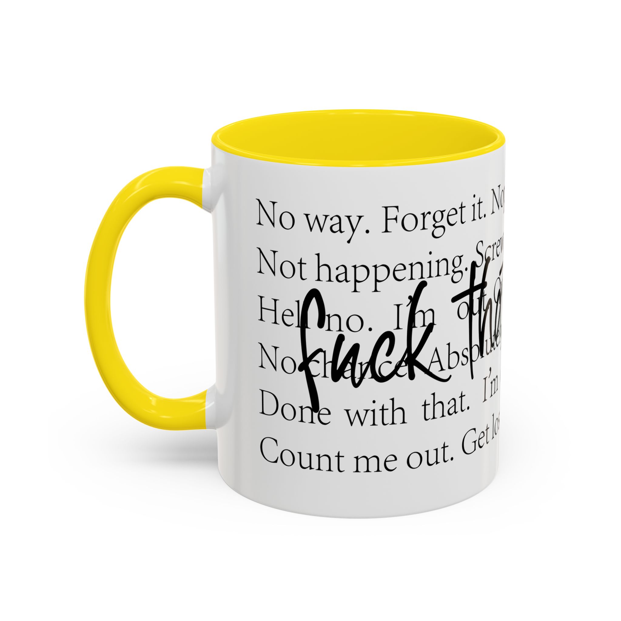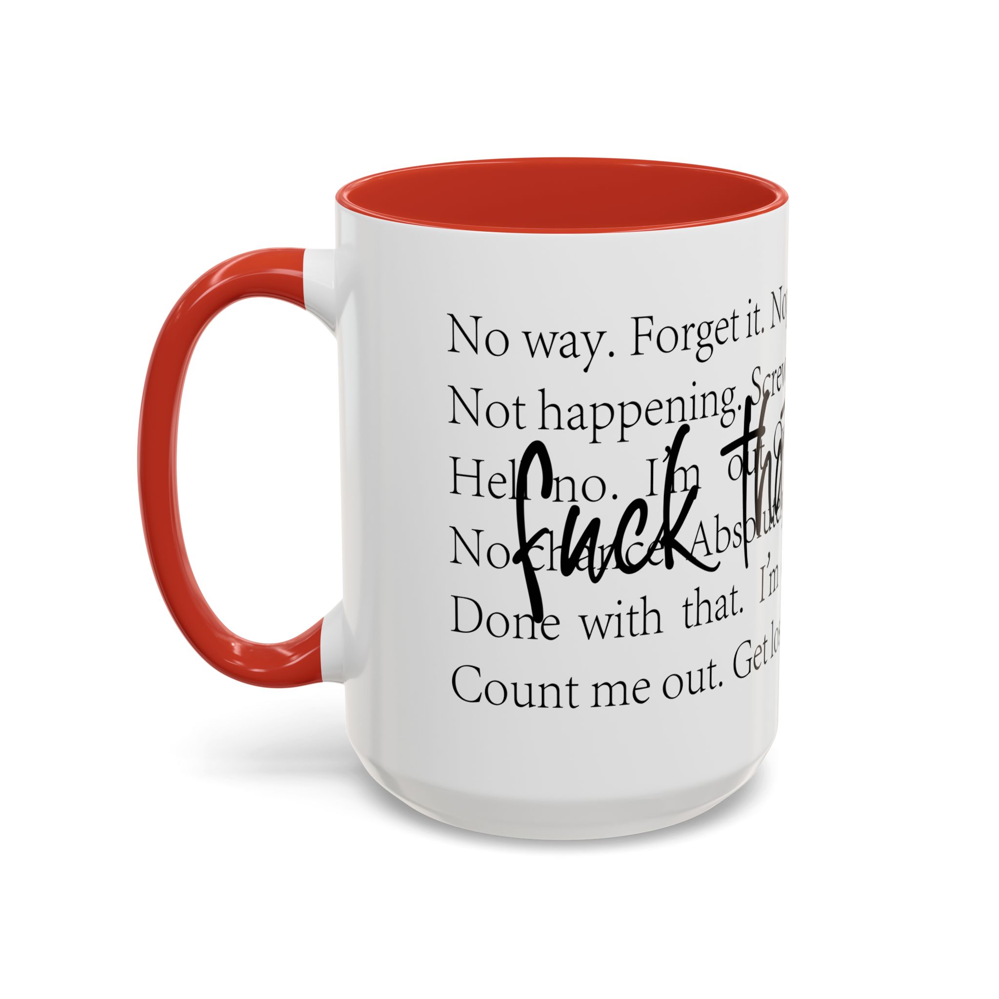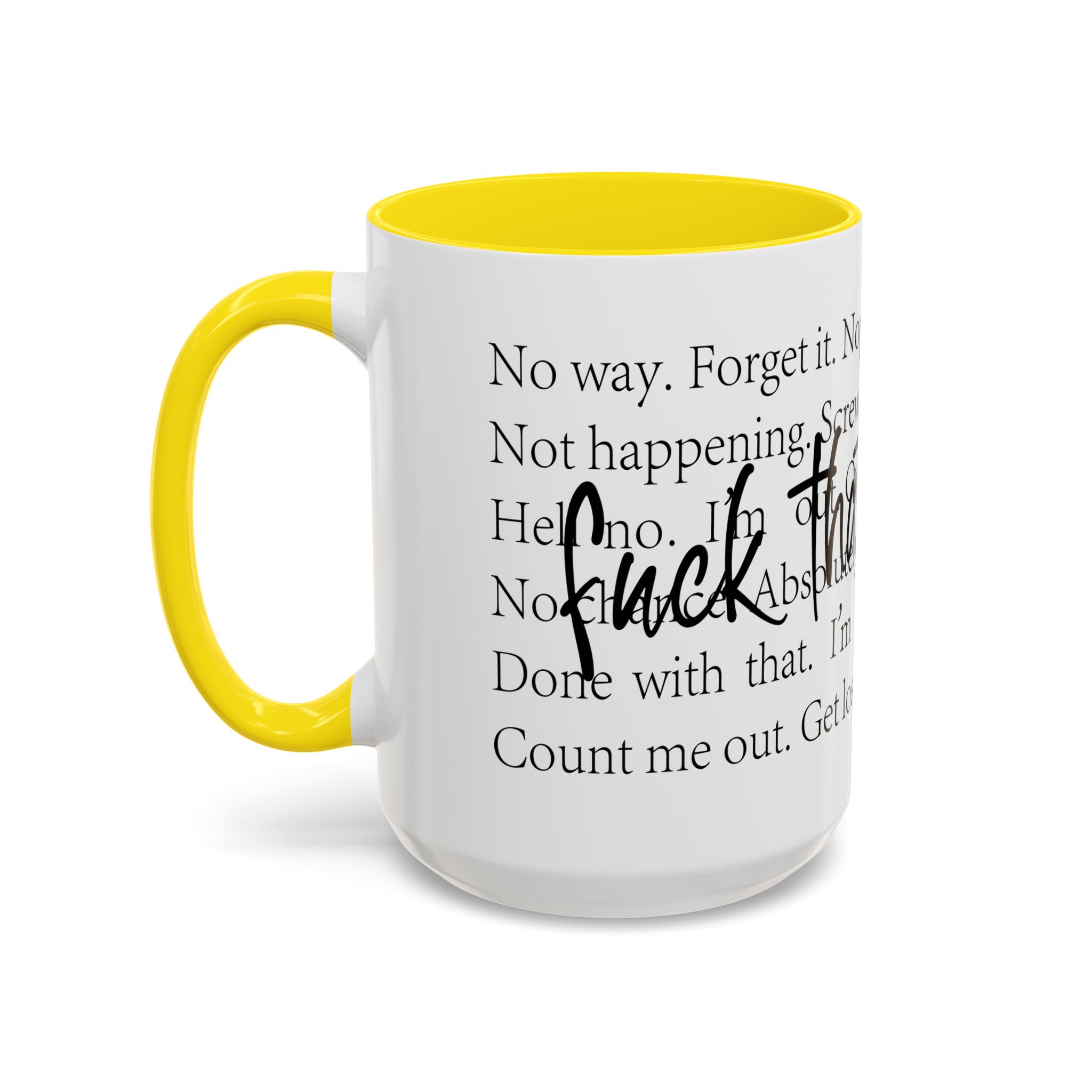 Enjoy your favorite beverages with this stylish Accent Coffee Mug. Made from durable white ceramic, this mug features a vibrant interior and handle available in multiple colors. Its glossy finish and eye-catching color contrast will make your morning coffee or tea a delightful experience. This mug is not just a kitchen essential; it adds a touch of personality to your home or office. Perfect for coffee lovers, this product is ideal for gifting on occasions like birthdays, holidays, or even just to brighten someone’s day. The ergonomic C-shaped handle ensures a comfortable grip, making every sip enjoyable. Ideal for anyone who appreciates a good laugh and needs a daily dose of motivation during their caffeine fix!