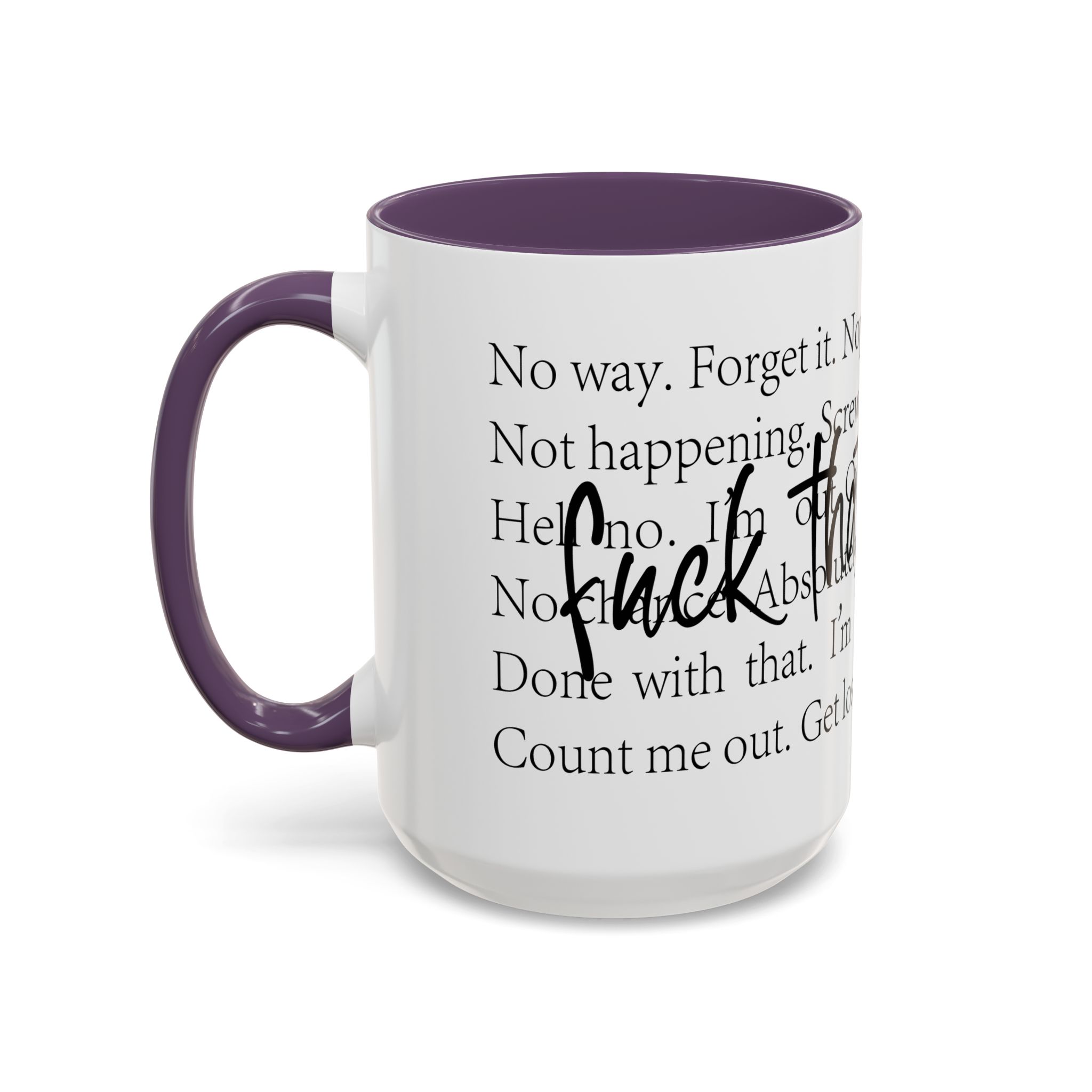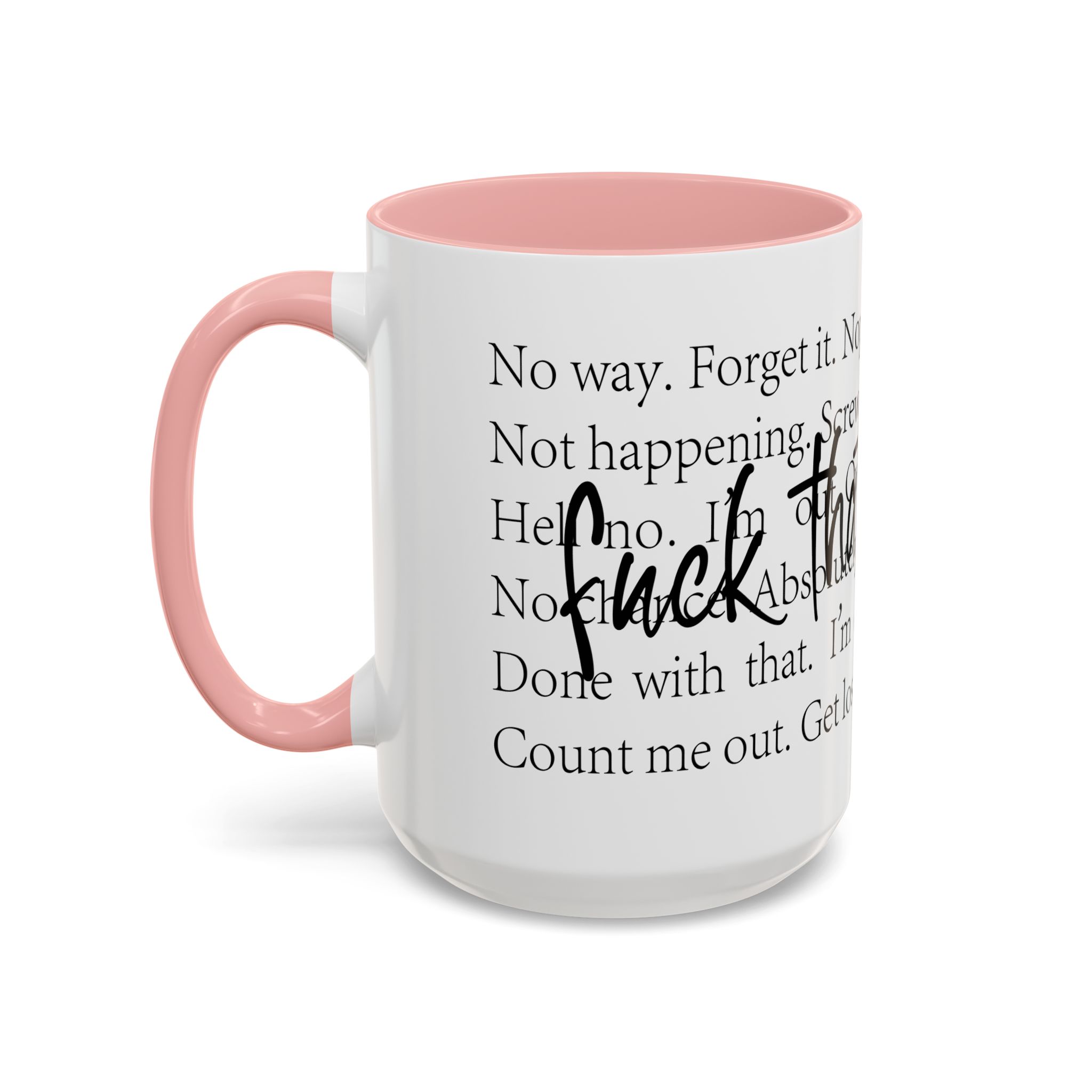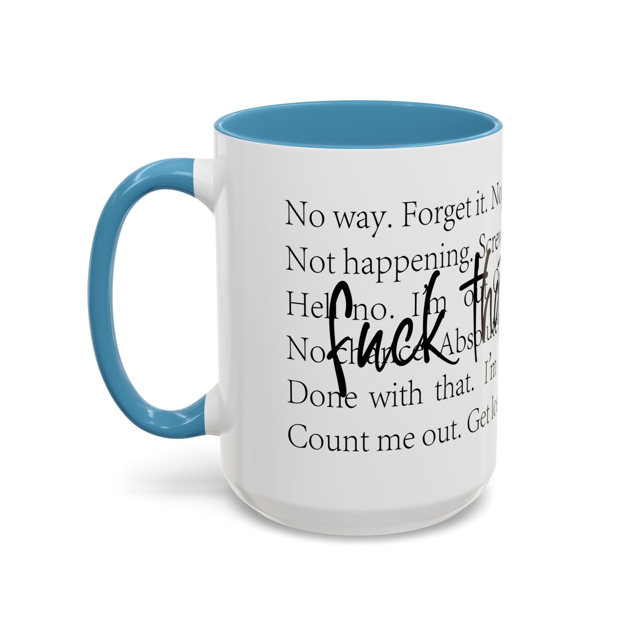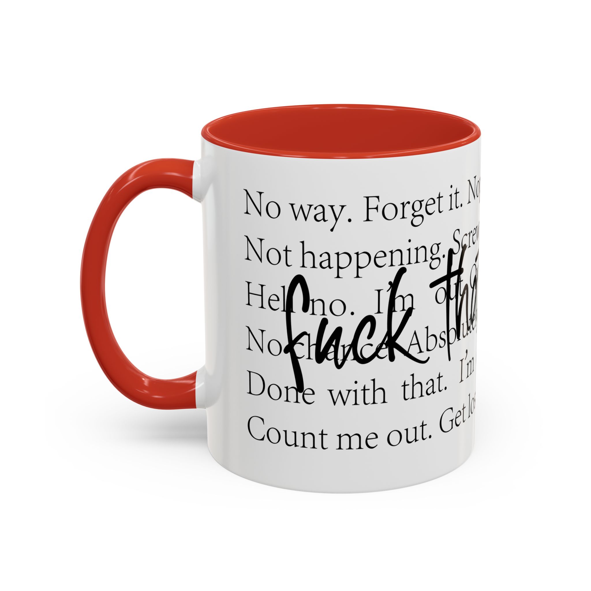 Enjoy your favorite beverages with this stylish Accent Coffee Mug. Made from durable white ceramic, this mug features a vibrant interior and handle available in multiple colors. Its glossy finish and eye-catching color contrast will make your morning coffee or tea a delightful experience. This mug is not just a kitchen essential; it adds a touch of personality to your home or office. Perfect for coffee lovers, this product is ideal for gifting on occasions like birthdays, holidays, or even just to brighten someone’s day. The ergonomic C-shaped handle ensures a comfortable grip, making every sip enjoyable. Ideal for anyone who appreciates a good laugh and needs a daily dose of motivation during their caffeine fix!